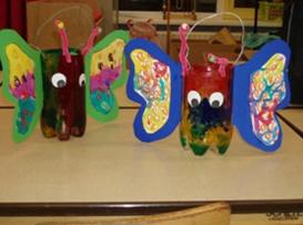 Vlinders. De basis is van een pet fles. Deze is beschilderd met glasverf. Twee losse, met wasco en ecoline versierde vleugels, die je tot halverwege in knipt en aan weerszijden over de fles schuift. Daarna even met goede plakband nog even vastzetten.